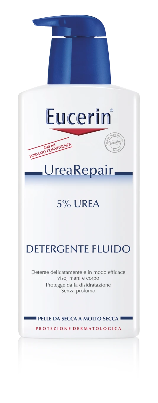 Eucerin Fluido detergente 5% Urea contiene solo agenti detergenti delicati, che lo rendono adatto alla detersione della pelle secca ed estremamente secca, inoltre è arricchito con Urea e Lattato, fattori idratanti naturali che legano l’acqua nello strato corneo (lo strato superiore della pelle).