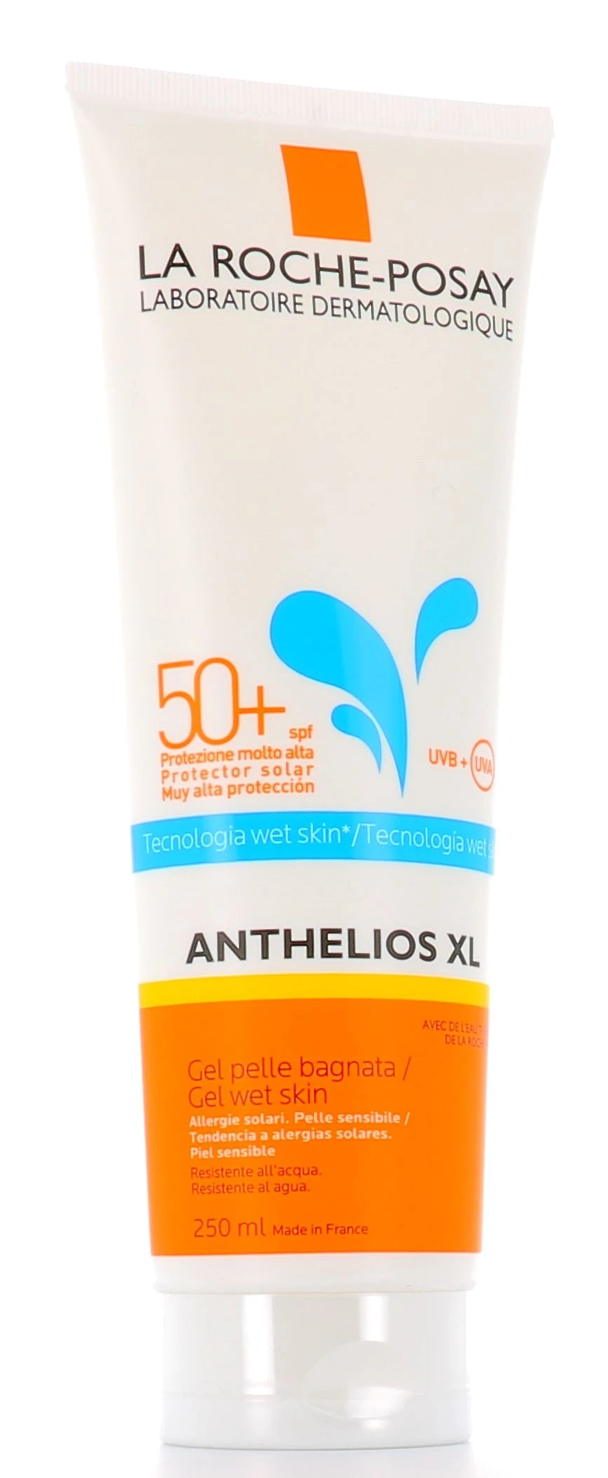 Gel invisibile idrorepellente per mantenere la protezione SPF50+ anche quando applicato su pelle bagnata.